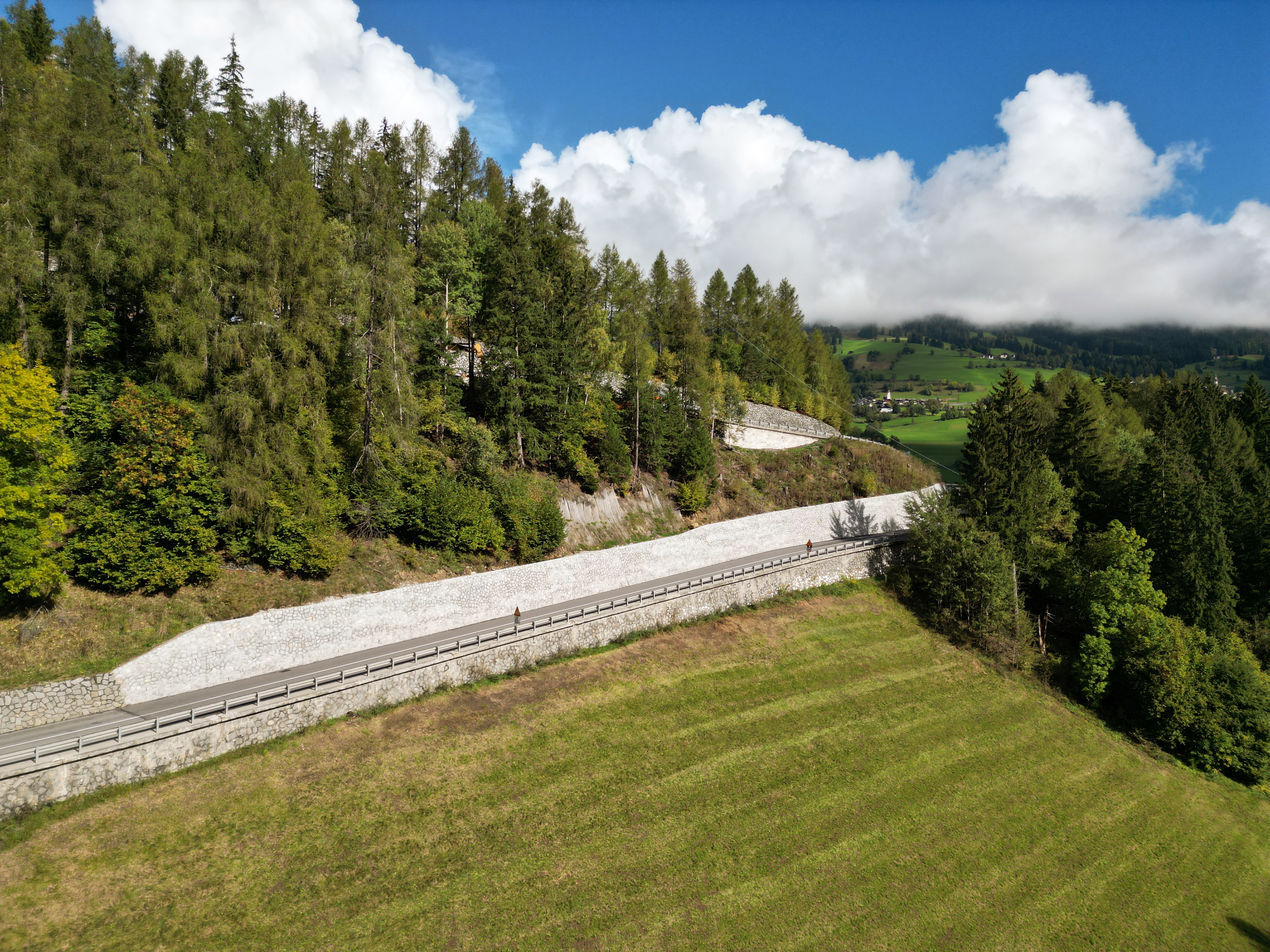 Nel quadro del progetto è stato effettuato il risanamento dei muri di sostegno lato valle e lato monte lungo la strada provinciale LS38 in direzione Racines. Inoltre, una zona interessata da frane del pendio doveva essere messa in sicurezza e stabilizzata.